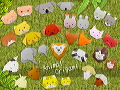 1.いぬ、2.ねこ、3.ぶた、4.こあら、5.きつね、6.とら、7.くま、8.ぱんだ、9.ねずみ、10.うさぎ、11.うし、12.やぎ、13.ひつじ-