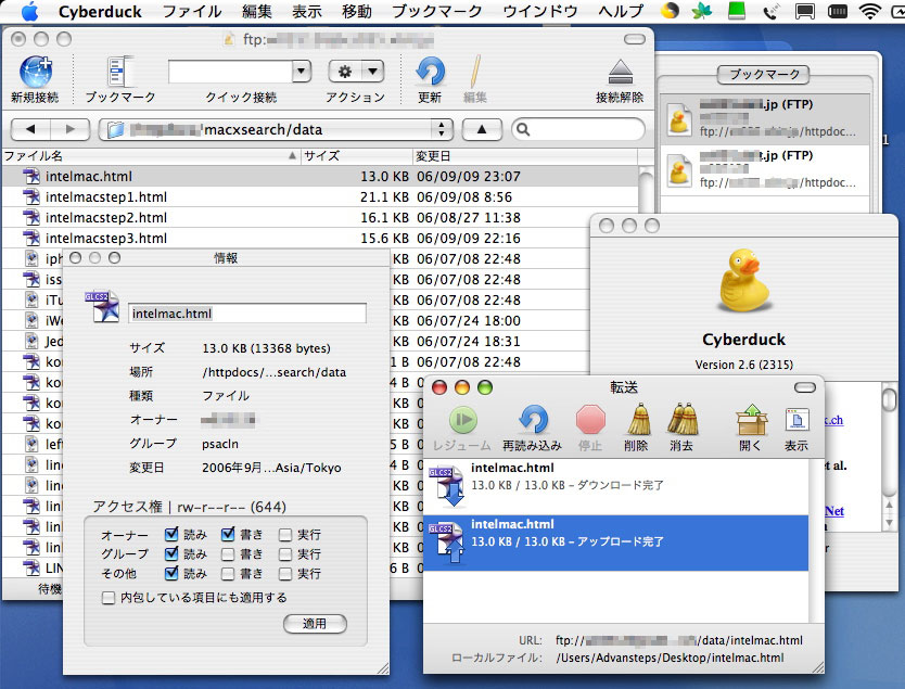 ファイルの転送に関しても、デスクトップやFinderで開いているファイルをドラッグ&ドロップするだけでアップロードが完了してしまう。おまけに、転送ウィンドウに詳しい情報まで表示してくれる。こんな簡単なアップロードはない。逆にダウンロードに関しては、ダウンロードしたいファイルをクリックするだけだ。