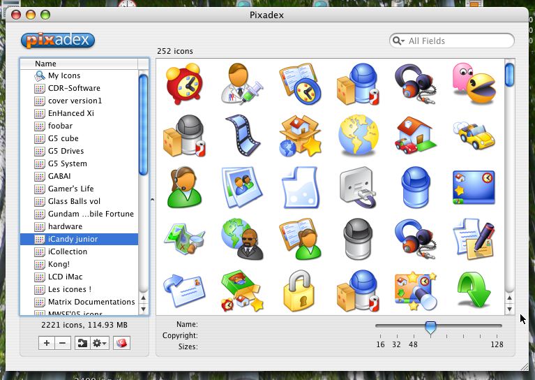 アイコンを集めたフォルダをこのウィンドウにドラッグ&ドロップするだけで、そのフォルダの第1階層にあるすべてのアイコンが一つの「コレクション」として登録される。「コレクション」ごとにタイトルを変えたりすれば管理がしやすくなる。もちろん、iPhotoと同じように、一度登録したアイコンも、ほかの「コレクション」に移動したりも簡単だ。また、便利なのは、ドラッグ&ドロップする際に、各アイコンのついたファイルないしフォルダについていたタイトルがそのアイコンの名前として登録される。あとでそのタイトルを検索すれば何千といったアイコンの中からも簡単に探せる便利さだ。