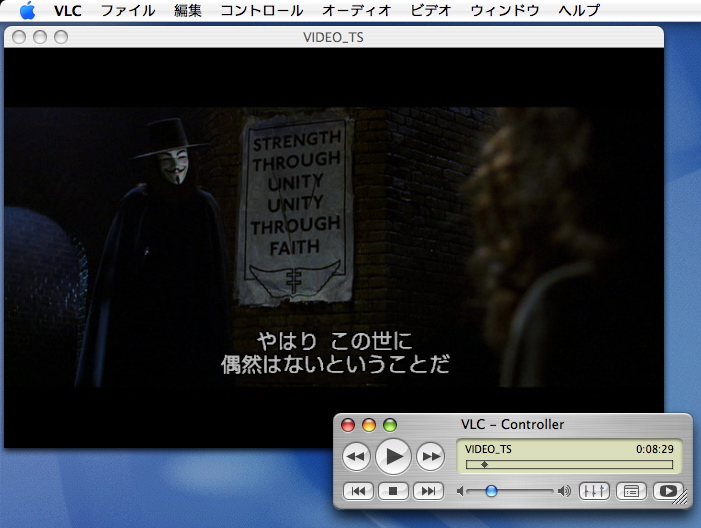 この動画プレーヤーの一番の特徴は、対応する動画フォーマットおよび音声フォーマットが多いことだ。一部をまとめただけでこんなにあるのだ(一部掲載していないが対応している動画フォーマットがある)。ここまで対応フォーマットの多い動画プレーヤーは存在しない。再生できずに困ったとき、このVLCにドラッグ&ドロップしてみると、けっこうの確率で再生できるのだ。テレビ録画のファイル(MPEG2)も、QuickTimeではMPEG2 componetをApple Storeから購入しないと再生できないのだが、このソフトはささっと再生してくれる。もちろんフリーである。また、QuickTImeではProを購入しないと全画面再生できないのだが、このソフトはどんな動画も「コントロール+F」で全画面再生だ。最新の動画フォーマットでは迫力のある動画を楽しめる。