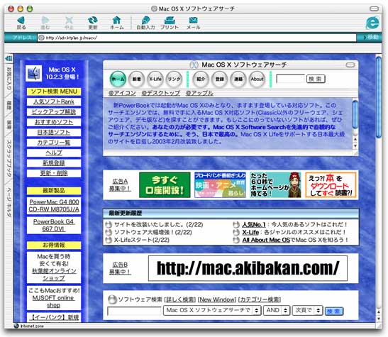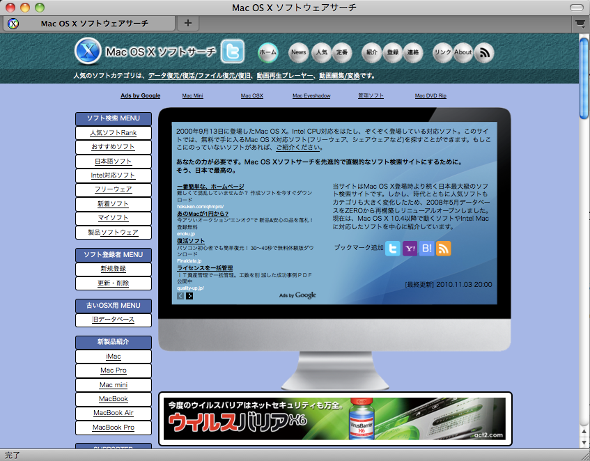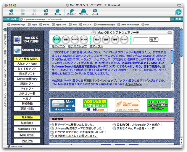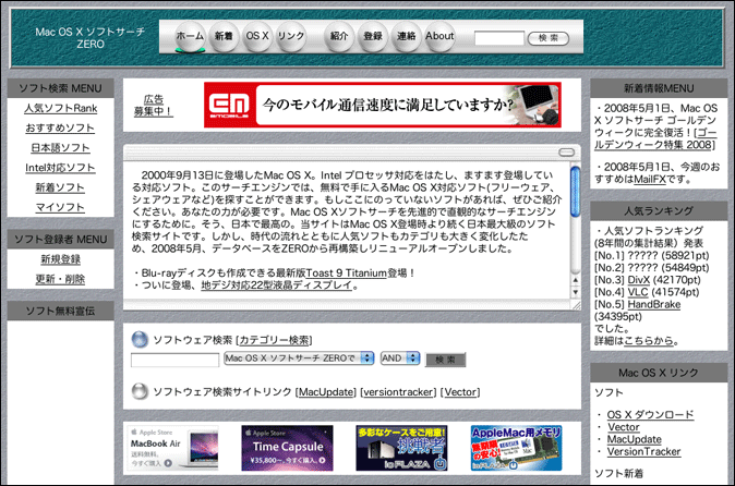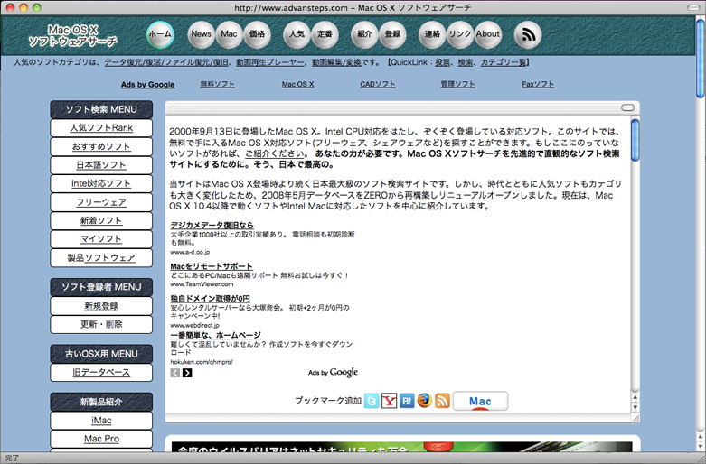 当サイトは2000年から存在する、最長期間、最大級ソフト数を誇るMac OS X ソフトウェア紹介サイトです。Mac OS XがPublic Beta版の頃から一緒に歩んできました。新しいソフトウェアの台頭に対応するため、2008年5月、データベースを0から再構築し、新着情報をBLOG形式へと移行しました。